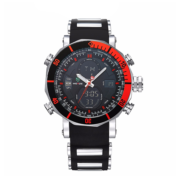 Weide WH5203 Stopwatch function Silicone Band And Stainless Steel Case watch, JAPAN 2035 Quartz Movements and LCD Digital movement With Original Batteries, Unique Electroplating 3D WEIDE Black Logo On Two Strap Rings. Watch Crown With Environmental IPS Bronze Electroplating, 30 Meters Water Resistant(Please Don't Press Any Keys Underwater), Walking On Error ±45S/M, Operating temperature:-10°C to +50°C.
